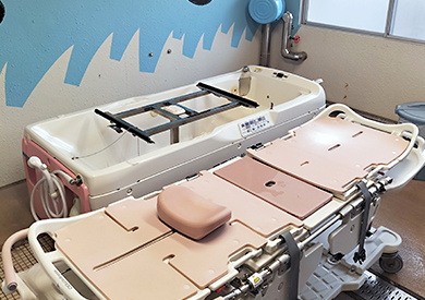 介護度が⾼い⽅でも寝たまま⼊浴できる特殊浴槽も完備しているので